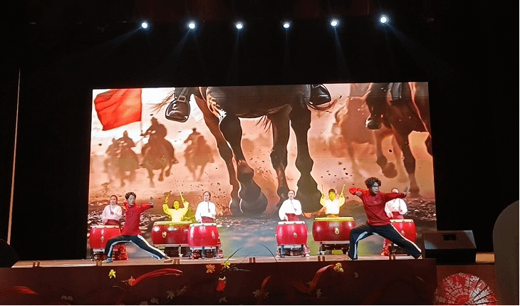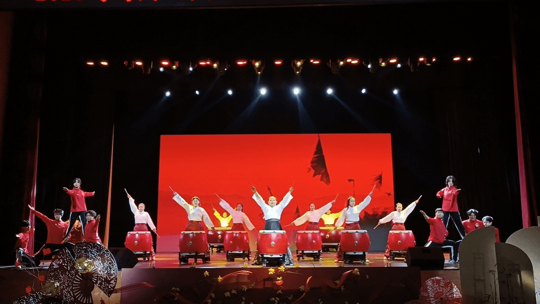 舞台灯光尚未亮起,六面朱红大鼓已在台侧列阵,鼓面鎏金的“云雷纹”与台下装饰的剪纸窗花遥遥呼应。随着第一束追光落在鼓队队员的鼓槌上,“咚——”的一声重响,武术队队员身着红色队服,以“三体式”起势跃入舞台中央。弓步沉身时,鼓点轻缓如战前风过旌旗;崩拳发力的刹那,鼓队的重槌同时落下,“宫音”的轰鸣裹着拳脚的破空声,让背景大屏里的甲胄骑兵剪影都似有了动态,这是《鼓武和鸣》的开篇,也是“鼓武共生”的第一个节点。