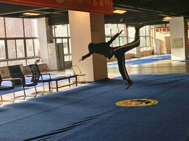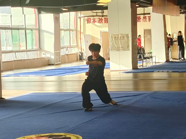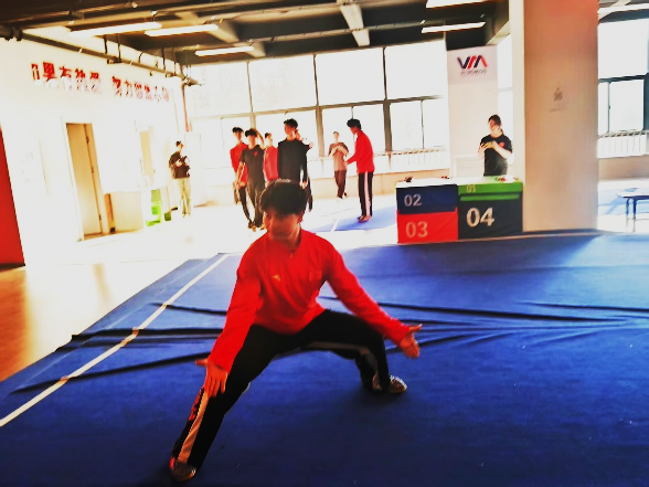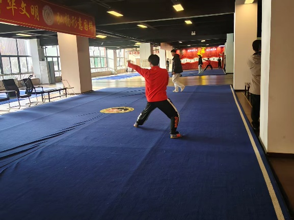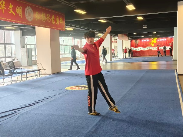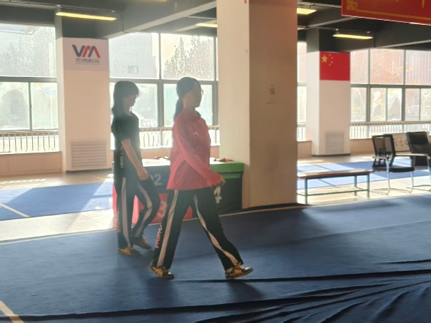调研团队一路参观来到学校武术训练馆,现场观摩武术队训练情况。训练馆内,队员们身着统一训练服,在训练垫上专注演练形意拳,弓步沉稳、出拳刚劲,崩拳、钻拳等招式连贯流畅,尽显形意拳“象形取意、内外兼修”的非遗特质。看到调研团队到来,队员们以标准武术抱拳礼致意,随后进行了形意拳组合展演,从“三体式”桩功到“五行拳”连贯套路,动作整齐划一、拳脚生风,将传统武术的刚健之美与青年学子的蓬勃朝气相融合,赢得现场一致肯定。